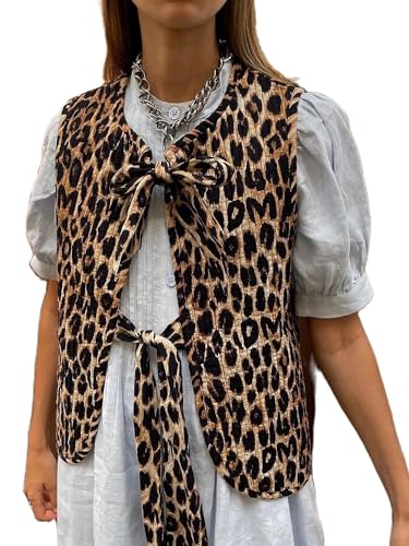 YILEEGOO Dam leopard quiltad väst ärmlös slips framtill västar väst blommig cardigan kappa jackor vadderade ytterkläder, Mörkbrunt, M