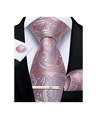 DiBanGu Män slips silke paisley blommig slips och ficka fyrkantiga manschettknappar slipsklämma set klassiska formella slipsar för bröllopsfest, Rosa paisley, en storlek