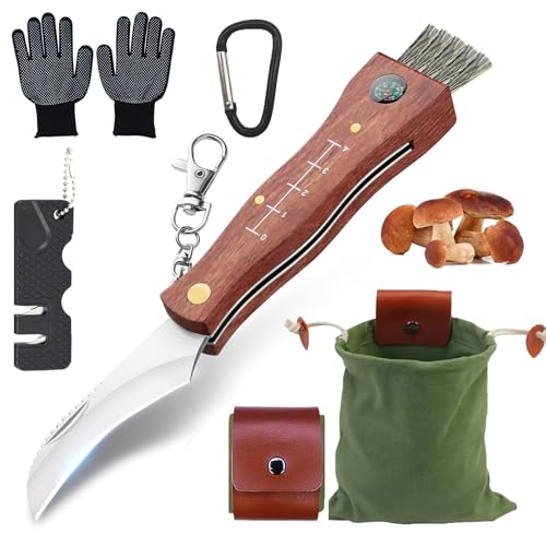 XHYASD Svampkniv med borste, bärbart svampsamlingssats, hopfällbar kniv i rostfritt stål för utomhusbruk, med handskar, svamppåse, slida, slipsten