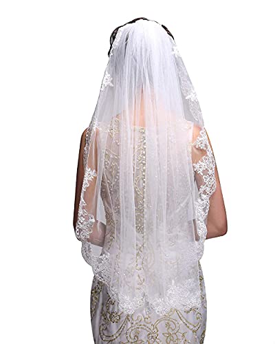Carufin Bröllop brudslöjor 1 rad spets blomkant tyll armbåge fingertopp längd slöja brud hårtillbehör med kam för kvinnor och flickor (elfenben)