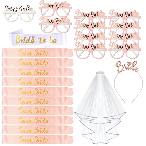 AniSqui tillbehör för möhippa, (1 skärp för brud + 10 lag brudskärp + 11 möhippa glasögon + 1 möhippa slöja + 1 tiara för brud, möhippa tillbehör, tillbehör (roséguld)