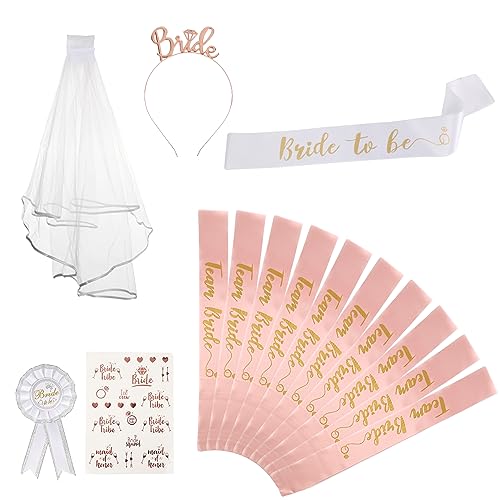 AniSqui Bride to be skärp, 16 st team bride skärp, (1 bride to be slipe + 10 team bride skärp + 3 bride tatueringar + 1 slöja + 1 brud tiara) jga tillbehör kvinnor