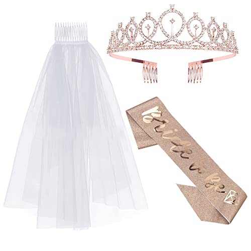 Bride to Be skärp och slöja, 3 stycken krona-hårband, vit slöja med kam, med skärp, för brud, möhippa, möhippa, bröllop, Roséguld, vit, 79cm / 12* 4 cm / 158* 9.5 cm