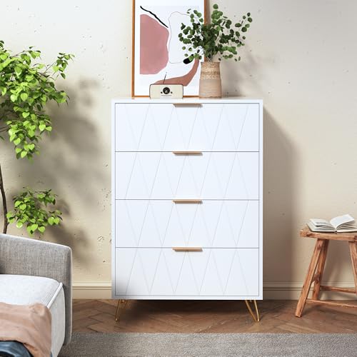 Mutuolux Byrå, förvaringsbyrå med 4 lådor, modern skandinavisk stil, ärmar och ben i guldfärg, smal byrå för vardagsrum, sovrum, hall, 60 x 34 x 90 cm, vit