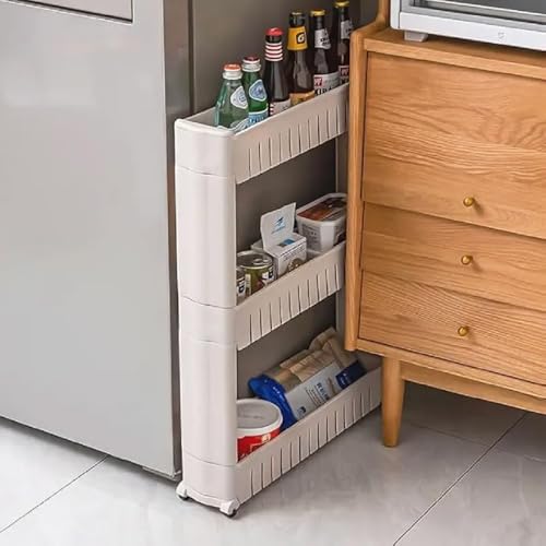 SOLEJAZZ Förvaringsvagn i 3 nivåer, skjutbar, smal, rullande, funktionell vagn, mobil förvaring, hyllor, organiserare för kök, badrum, tvättstuga, sovrum, smala platser, plast, vit