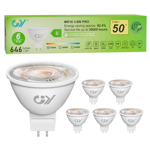 GY GU5.3 LED-lampor MR16 12V klass B, 646LM varmvit 3 000K, 3,8W motsvarande 50 W 36° LED-vinkel spotlight (smal stråle), energieffektivitet, dimbar, inget flimmer, set med 6 st