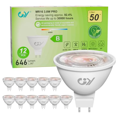 GY GU5.3 LED-lampor MR16 12V klass B, 646LM neutral vit 4 000K, 3.8W motsvarande 50W GU10 36° vinkel (smal stråle), LED-spotlight, dimbar, 12 st