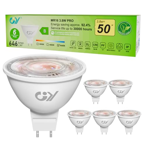 GY GU5.3 LED-lampor, MR16, 12 V klass B, 646LM kall vit 6 500K, 3,8W motsvarande 50 W 36° LED-vinkel spotlight (smal stråle), energieffektivitet, dimbar, inget flimmer, set med 6 st