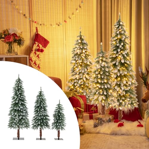 COSTWAY Konstgjord julgran, 3 delar, 90 + 120 + 150 cm, julgran med snö och varmvita LED-lampor, smal gran med metallstativ, snöigt konstträd, PVC-barr, grön