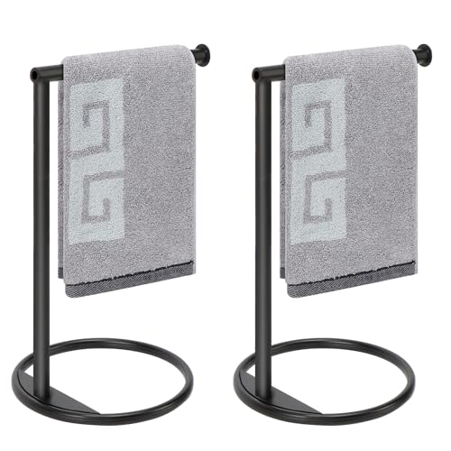 NearMoon Hand Towel Holder Stand, Thicken Metal L Shape Hand Towel Rack, Small Towel Ring, Stable Standing Towel Bar for Bathroom Kitchen Vanity Countertop, 8” L 14” H (Matte Black, 2 Pack)
