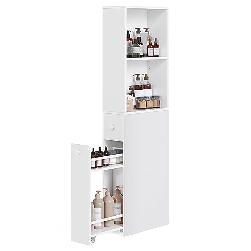 VASAGLE Högt badrumsskåp, smalt förvaringsskåp för badrum, fristående smal förvaringsenhet med lådor och justerbar hylla, för små utrymmen, modern stil, klassisk vit BBK567T14