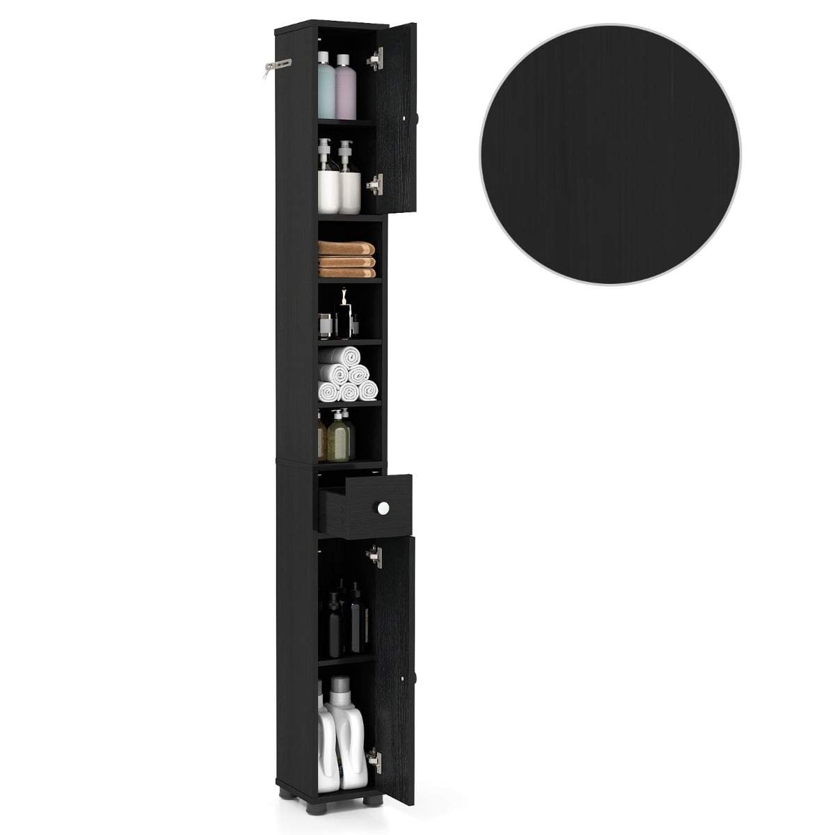 COSTWAY Toalettskåp, högt skåp, smalt badrumsskåp med 2 dörrar, 1 låda och justerbara hyllor, platsbesparande badrumshylla för badrum, vardagsrum, kök, 20 x 20 x 180 cm (svart)