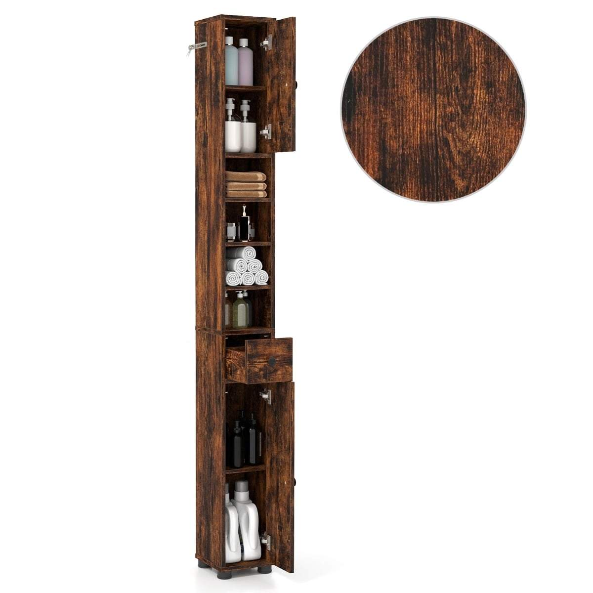 Smalt badrumsskåp – justerbara hyllor och låda, MDF brun
