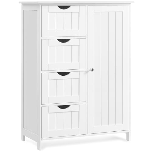 VASAGLE badrumsskåp, smalt badrumsskåp, sidoskåp, byrå, med 4 lådor, skåplucka, justerbart hyllplan, 35 x 65 x 90 cm, molnvit LHC042W01