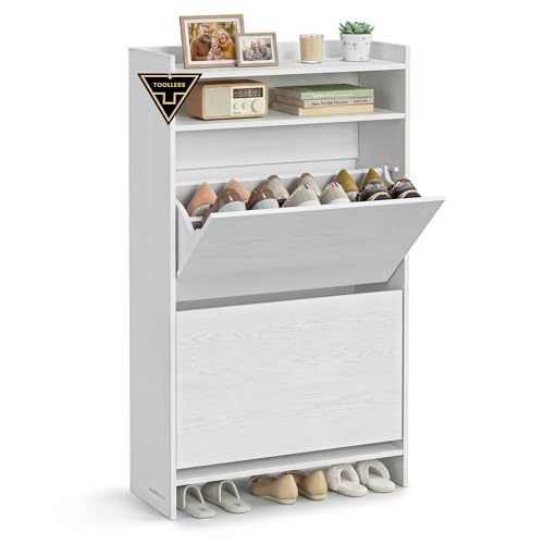 GarveeHome Smalt skoskåp med 2 klaffar, smalt fristående skoskåp för entrén, med tippskyddsset, dolt skofack med hylla