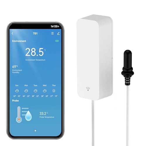 Smart termometer, hygrometer, WiFi-temperatursensor med extern sond, väderfunktionstermometer, fuktmätare för frys, akvarium, applarm, fjärrmonitor, arbeta med Alexa.1 st