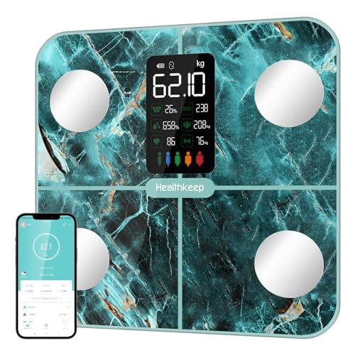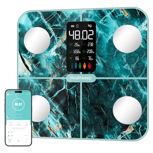Healthkeep Kroppsfettvåg personvåg, våg, personer med kroppsfett och muskelmassa 15 kroppsdata kroppsvåg med kroppsfettanalys, smart våg med app, stor skärm, iriserande marmorgrön