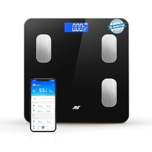 Ant Esports Flora Smart våg för kroppsvikt och fett, digital badrumsvåg exakt till 0,1 kg vägningsmaskin för människors muskel BMI, Bluetooth elektronisk kroppssammansättningsskärm, 180 kg – svart,