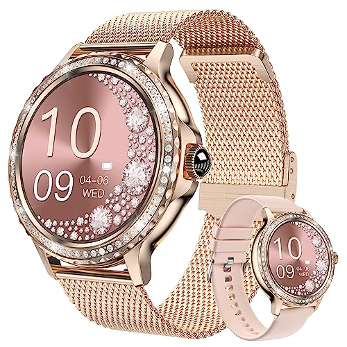 Fitonyo Smartwatch dam med telefonfunktion diamant, 1,29 tum pekfärgskärm, pulsklocka, SPO2, sömnmonitor, menstruationscykel, 19 sportlägen, musik, smartklockor för kvinnor (diamant roséguld)