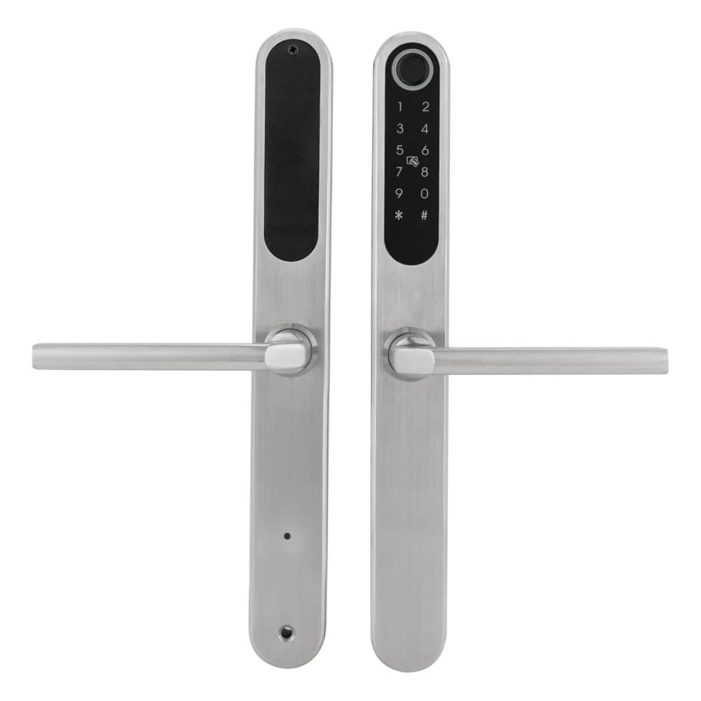 Smartlås för skjutdörr - Dörrlås med handtag - Fingeravtryck, kod, IC-kort, Bluetooth - IP45 - 304 rostfritt stål - för 45–60 mm dörrar - Silver