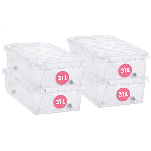SmartStore 31 L förvaringslådor under sängen i plast med lock - set om 4 - genomskinliga - sammankopplade och stapelbara - lämpliga för kontakt med livsmedel, BPA-förslutning med vita klämmor - L 72 x