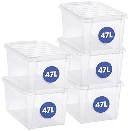 SmartStore 47L genomskinliga stora plastförvaringslådor med lock – set med 5 – genomskinliga – stapelbara och stapelbara – 10 års garanti – livsmedelssäker och BPA-fri – vit klämma låst – L 59 x B 39