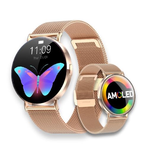 Efolen Smart klocka för kvinnor med Bluetooth-samtal, 1,1 tum, AMOLED, rund, Smartwatch, sömnmonitor, hjärtfrekvens, 110+ sportklocka, smart klocka, IP68, stegräknare, för Android iOS, roséguld