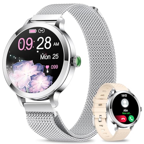 Popglory Smartwatch för kvinnor med samtal och röstassistent, 4,85 cm smartwatch dam 2 remmar, armband aktivitet blodtryck hjärtfrekvens syre blod, gåva för kvinnor och män, Android iOS