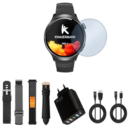 Knauermann PRO 4 EKG-hälsoklocka med telefonfunktion – smartwatch i svart – puls, blodtryck, syre, HRV, sömnanalys – för kvinnor och män – premiumset med 5 armband svart