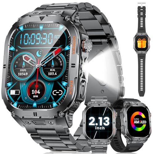 ESFOE Smartwatch män 3 ATM vattentät med samtal/LED-ficklampa, 2,13 tum HD AMOLED stor skärm militär smartklocka med kompass, 100+ sportlägen träningsklocka med SPO2/puls för Android iOS