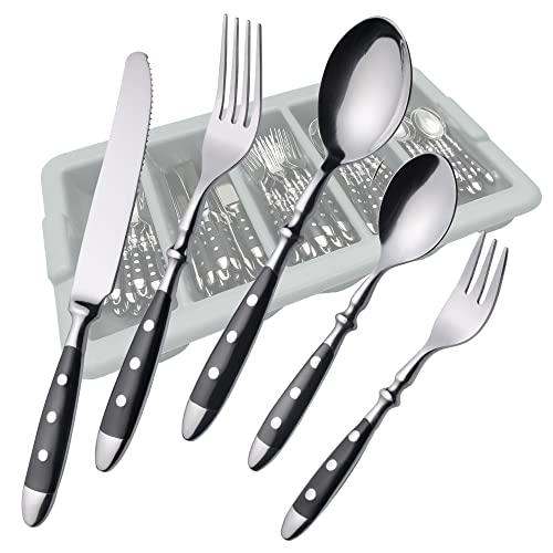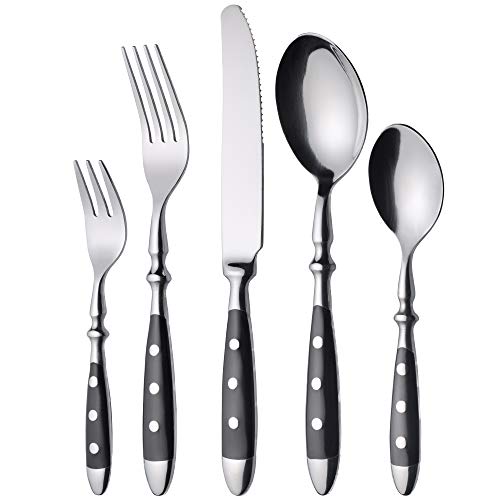 GRÄWE bestickset för 6 personer av rostfritt stål, tung, rustik, bordsbestick-set 30 delar, smidda bestick med svarta handtag – Serie Nürnberg