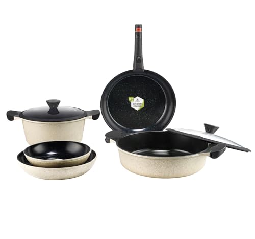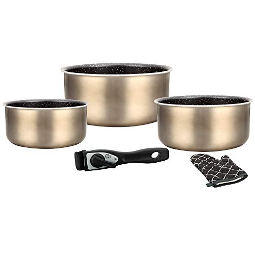 Herzberg - Induktions Kokkärlset 5-Delar - Smidda Aluminium Kastruller och Stekpanna med Marmorbeläggning och Avtagbart Handtag - Koppar