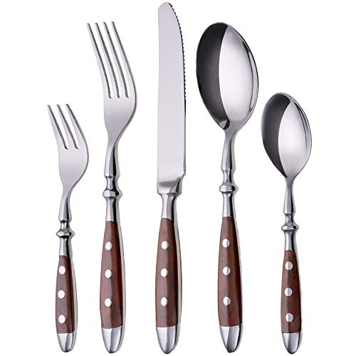 GRÄWE bestickset för 6 personer av rostfritt stål, tung, rustik, bordsbestick-set 30 delar, smidda bestick med bruna handtag – Serie Nürnberg