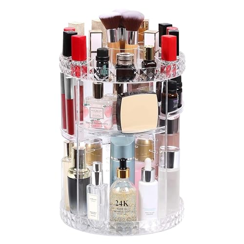 MOKANI 360 graders roterande akryl sminkorganisatör, justerbar kosmetisk förvaring hudvård smink spinninghållare läppstift borstar parfym display stativlåda, perfekt för byrå, sovrum, badrum (klar)