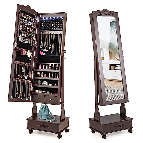 COSTWAY Smyckesskåp med spegel, LED smycken spegelskåp med låda, smyckesorganisatör låsbar, på rullar, perfekt för förvaring och smink