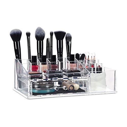 Relaxdays, transparent sminkförvaring med låda, kosmetisk förvaring för smink och smycken, läppstiftshållare, plast, 15 fack