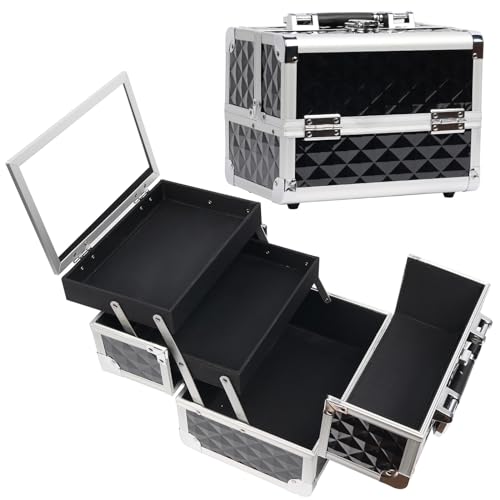 EBANKU Smink tågfodral kosmetisk låda bärbar makeupfodral organiserare 2 brickor sminkförvaring med spegel och borsthållare, låsbar (svart