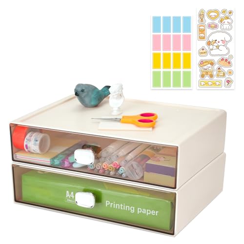 2 st skrivbordslådor med 2 lådor, stapelbar A4-papper kontor organisatör låda med etiketter, stor plast kontor hantverk förvaringslåda för brevpapper, smink (L 2 x vit)
