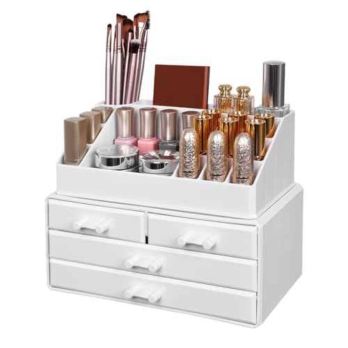 hudvårdsorganisatör, smink skrivbordsorganisatör med lådor, bänkskiva organiserare för kosmetika, sminkborste med hållare för läppstift, borstar, ögonskugga och smycken skrivbordsdekoration (vit)