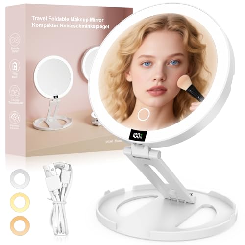 SURFOU Sminkspegel med USB-uppladdningsbara LED-lampor, 1500mAh vikbar bärbar dubbelsidig 1X/20X, 3 lägen justerbar touch minnesljus, perfekt för smink badrum och resor