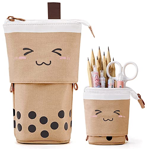 JANREAY 2-i-1 sött pennfodral teleskopiskt pennfodral, popup pennhållare, stativ-up infällbar pennhållare smink väska för studenter, kontor kvinnor, flickor pojkar, BRUN, En storlek, teleskopisk