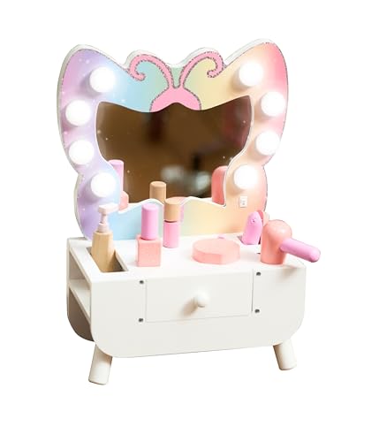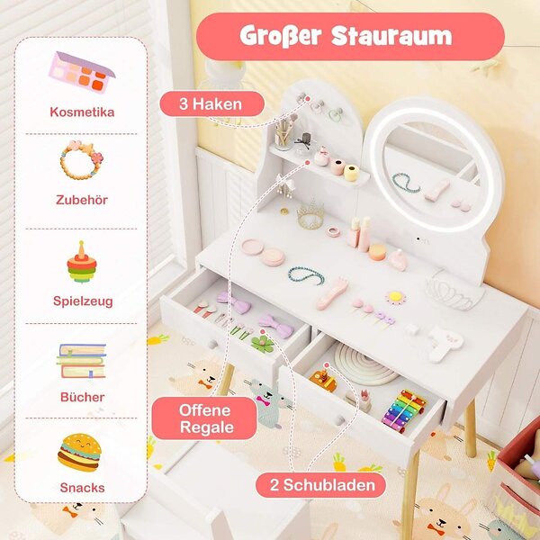 Sminkbord för barn med pall – LED-spegel, förvaring