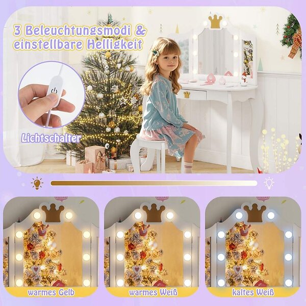 COSTWAY Sminkbord för barn med belysning, toalettbord för flickor med tredubbel vikbar spegel och låda, sminkbord av trä med pall, sminkbord för barn från 3 år (vit)