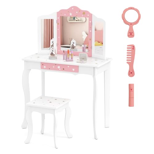 COSTWAY Sminkbord för barn med pall, prinsessa toalettbord med låda och 3-vägs vikbar spegel, toalettbord, rosa vitt, sminkbord för flickor