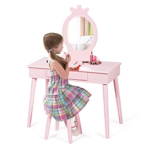 GOPLUS Sminkbord för barn med pall, flicktoalettbord med spegel, sminkbord barn med låda, sminkbord, trä för barnrum (rosa)