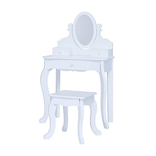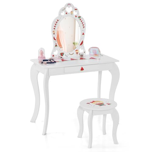GIANTEX Sminkbord för barn med pall, sminkbord, kosmetikabord med lådor, löstagbar spegel, toalettbords-set för flickor, toalettbord, trä (vitt)