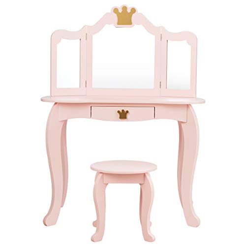 COSTWAY Sminkbord för barn, prinsessa, toalettbord med vikbar spegel, sminkpall och 3 lådor