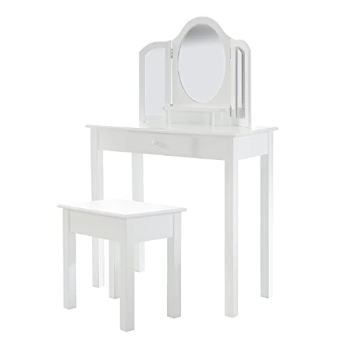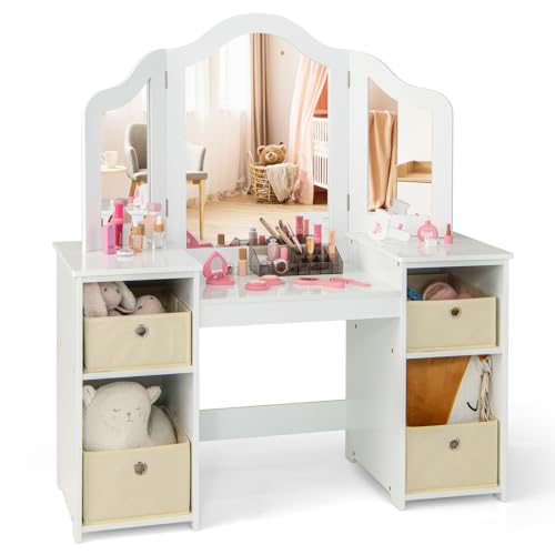 Fantaskk 2-i-1 barnsminkbordsset, sminkbord för barn, flickor med trippel hopfällbar spegel och låda, prinsessa-sminkbord med sminkpall i vitt