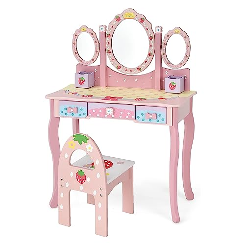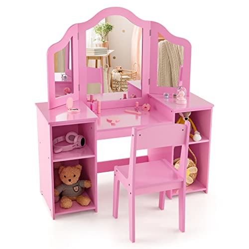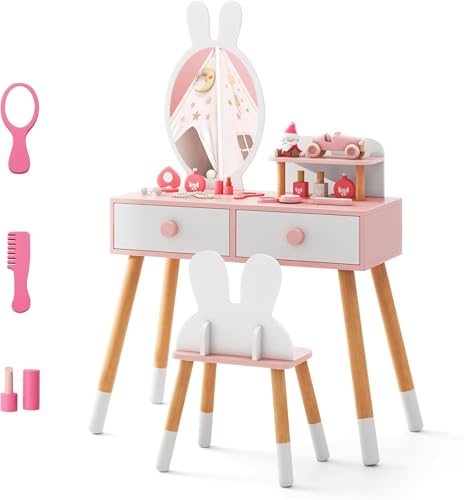 GIANTEX Sminkbord för barn med pall, sminkbord, sminkbord med lådor, avtagbar spegel, toalettbord för flickor, toalettbord, trä (rosa)