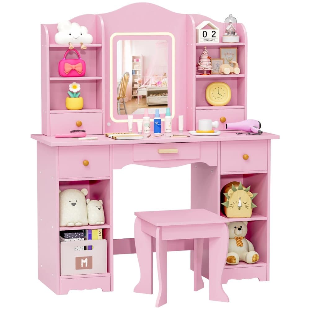 COSTWAY Sminkbord för barn med belysning, toalettbord för flickor med tredubbel vikbar spegel och låda, sminkbord av trä med pall, sminkbord för barn från 3 år (rosa)